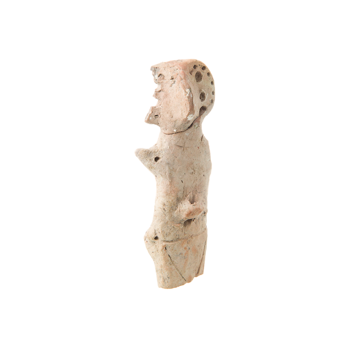 Збережений фрагмент світлого сірого кольору. Голова дисковидної приплюснутої форми з довгим носом змодельваним защипом . По краю диску йдуть невеликого діаметру наскрізні отвори (права частина втрачена). В районі очей два наскрізні отвори більшого діаметру. Товста, кортка шия, що переходить в плечові виступи з наскрізними отворами, що імітують підняті руки (ліва втрачена) Пупок зображено рельєфним горбиком з наскрізним вертикальним отвором. На рівні стегон з правої сторони зроблено наскрізний отвір. . Низ живота прокреслений заглибленими лініями у вигляді трикутника. |