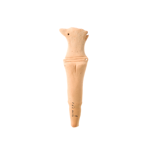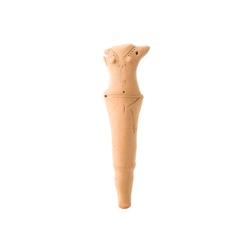 Фігурка жіноча. Втрачена голова і конічний виступ правої руки. Виріб теракотового кольору. Статуетка досить пропорційно змодельована. Коротка шия плавно переходить в плечові конусоподібні виступи з наскрізними отворами. На шиї заглибленями та лінією виділено намисто. Невеликими наліпами зображено груди. Права сторона тазобедреного виступу позначена скрізним отвором. Пупок зроблений заглибленням. Ділянка лона графічно підкреслена зображенням трикутника, виконаного заглибленими лініями. Сідниці змодельовані рельєфним виступом. Ноги сформовані монолітно без завершення стопи. |